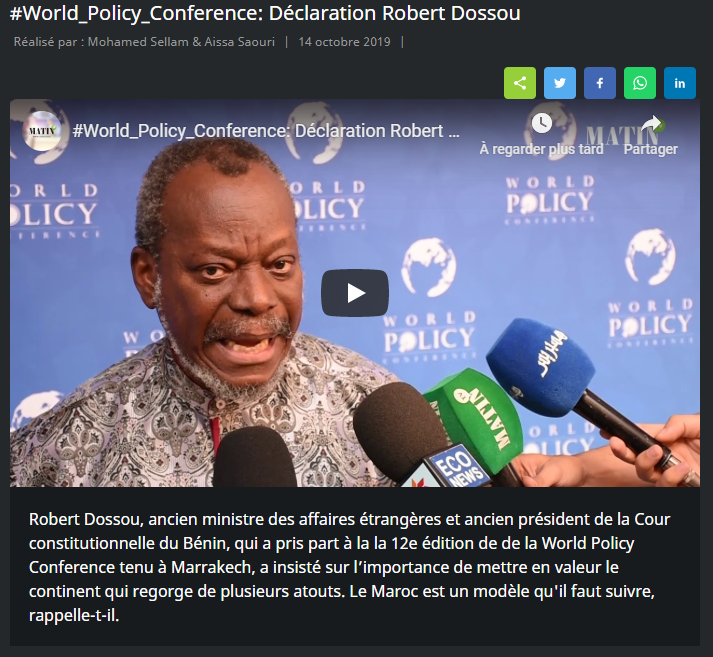 VIDEO – Robert Dossou, ancien ministre des affaires étrangères et ancien président de la Cour constitutionnelle du Bénin, qui a pris part à la 12e édition de la World Policy Conference tenue à Marrakech, a insisté sur l’importance de mettre en valeur le continent qui regorge de plusieurs atouts. Le Maroc est un modèle qu’il faut suivre, rappelle-t-il.
